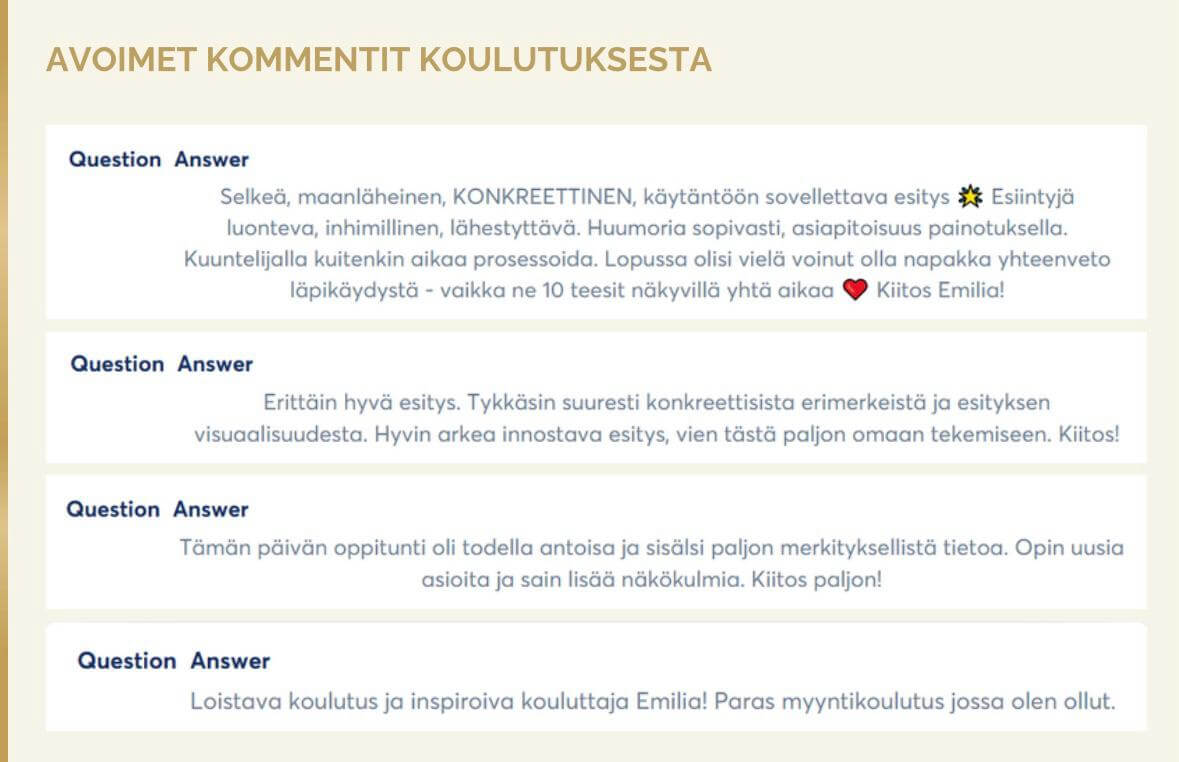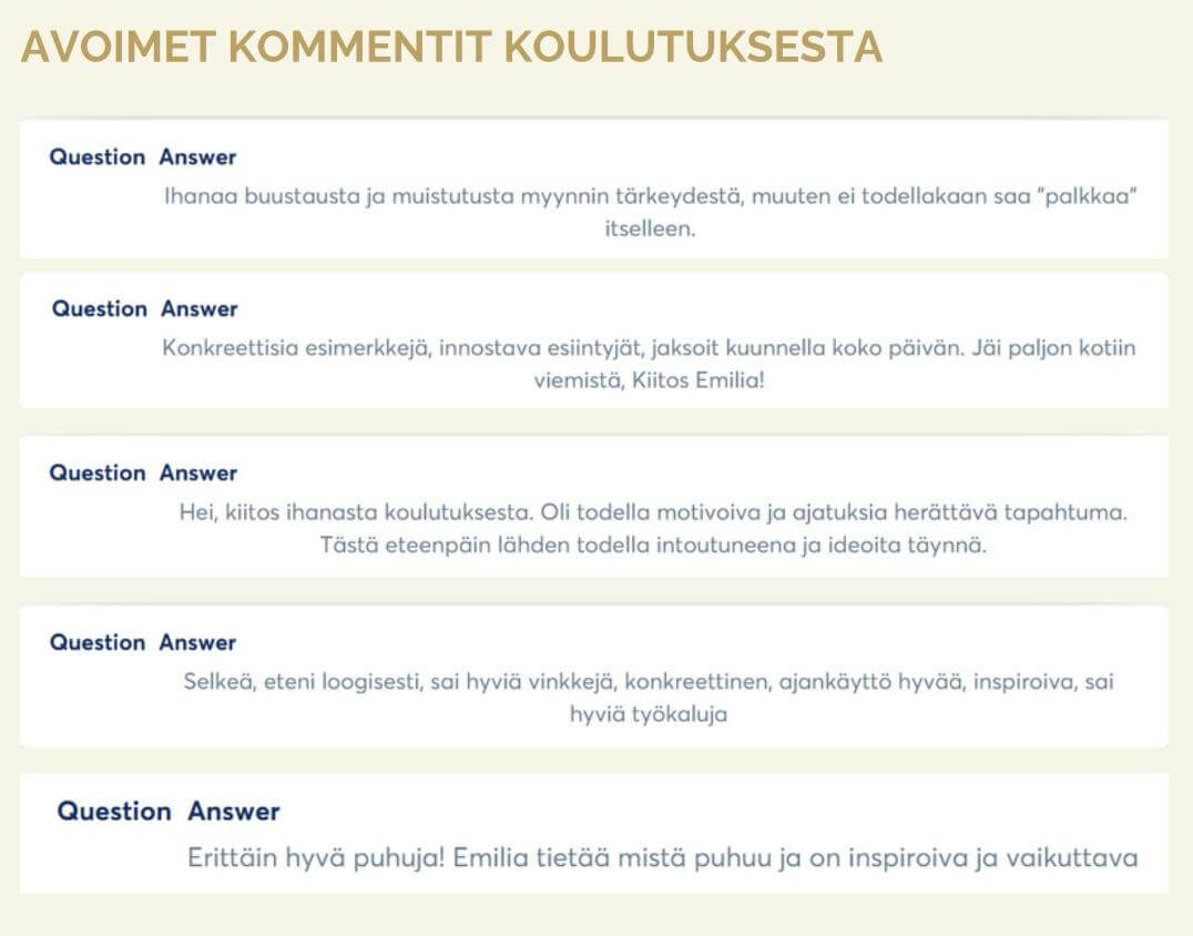 Emilia osasi herätellä sekä innostaa asiakkaitamme myyntiin tavoitteiden sekä kilpailuedun kautta. Emilia on ammattitaitoinen ja inspiroiva, koulutus oli kattava ja innostava.
